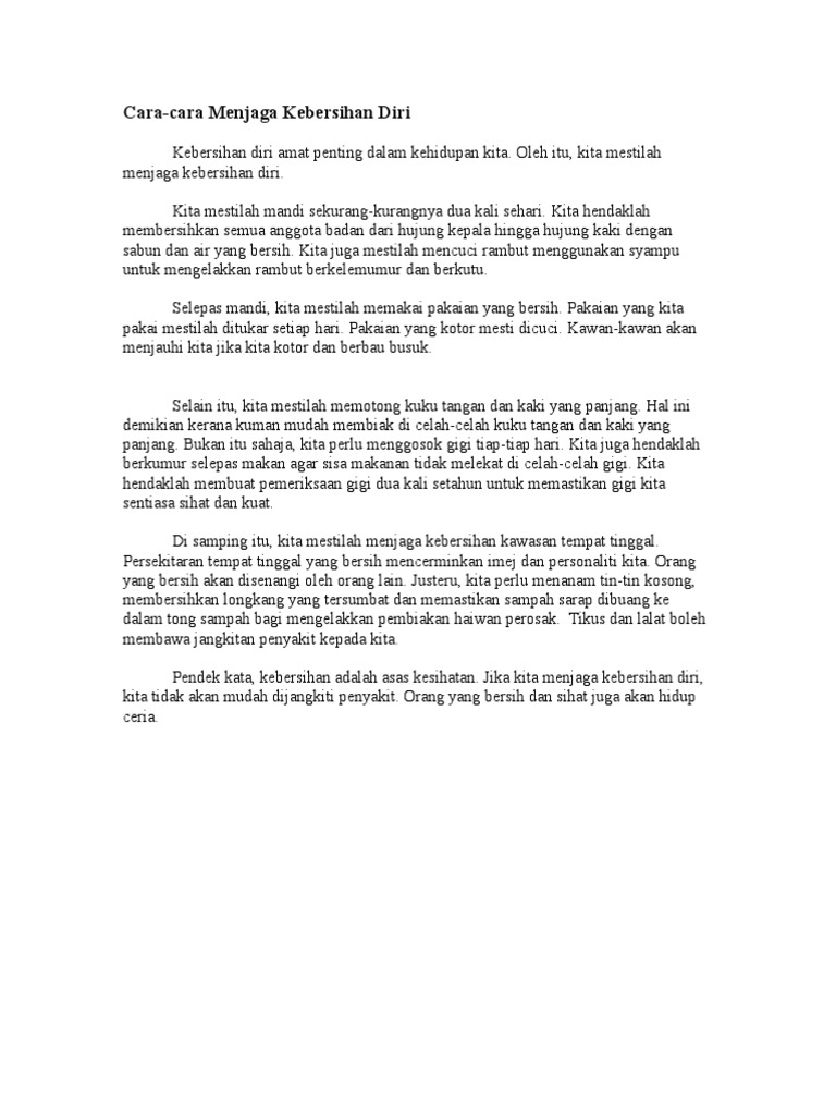 Langkah langkah menjaga kebersihan diri karangan. Ada banyak cara untuk memastikan kesihatan seseorang itu dalam keadaan baik. Oleh itu kita mestilah menjaga kebersihan diri. Soalan Penjagaan kesihatan diri sangat penting kepada kita.